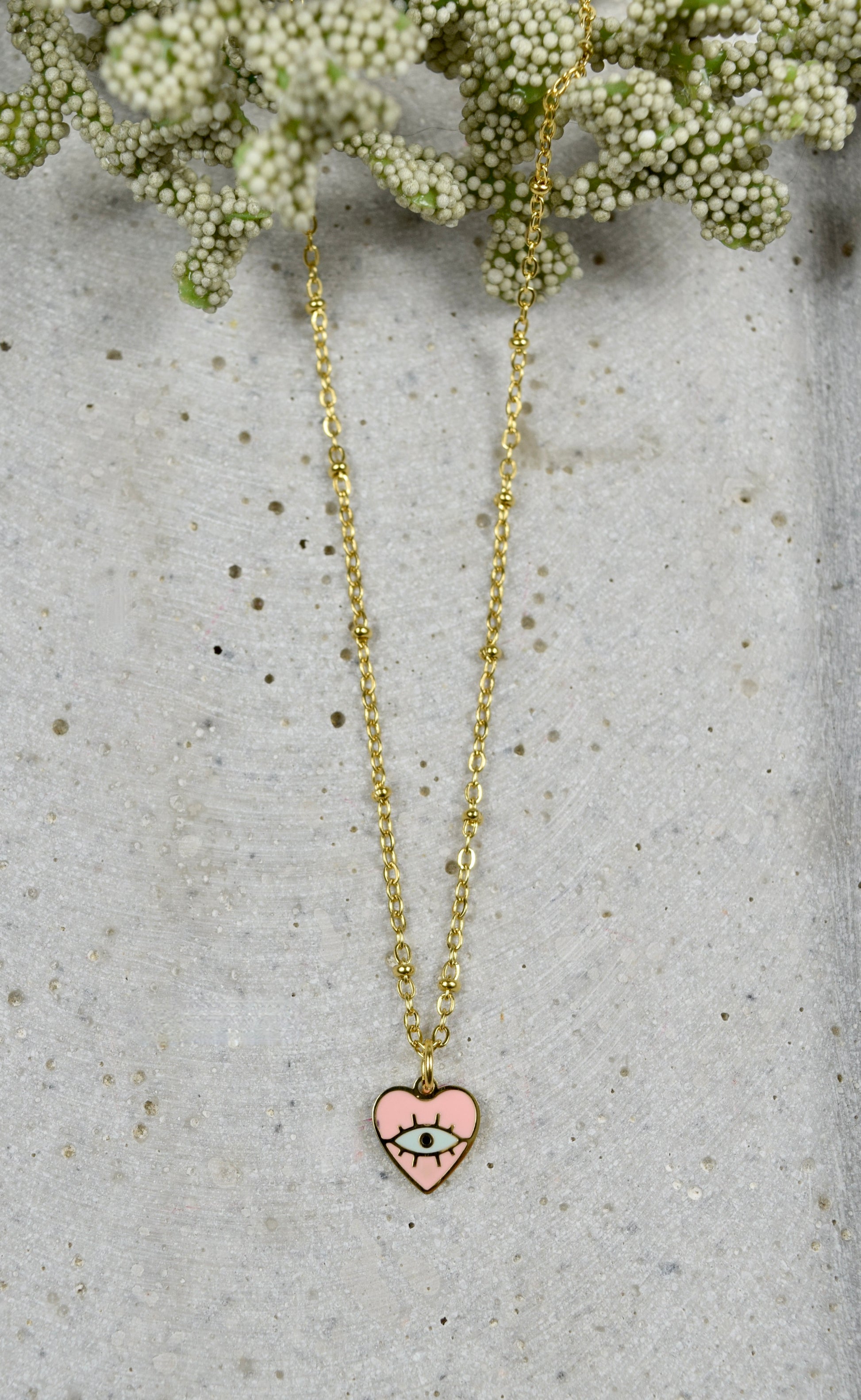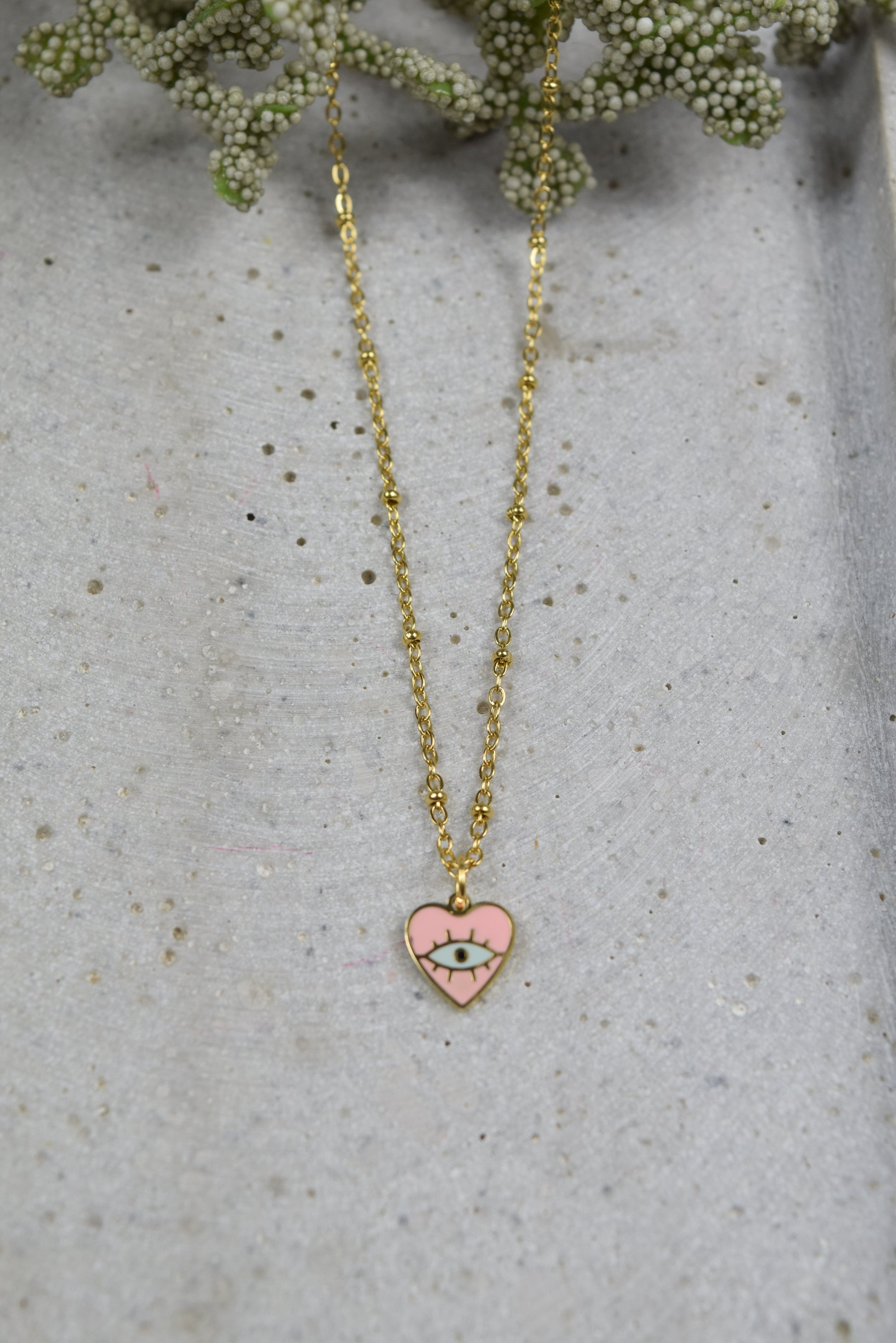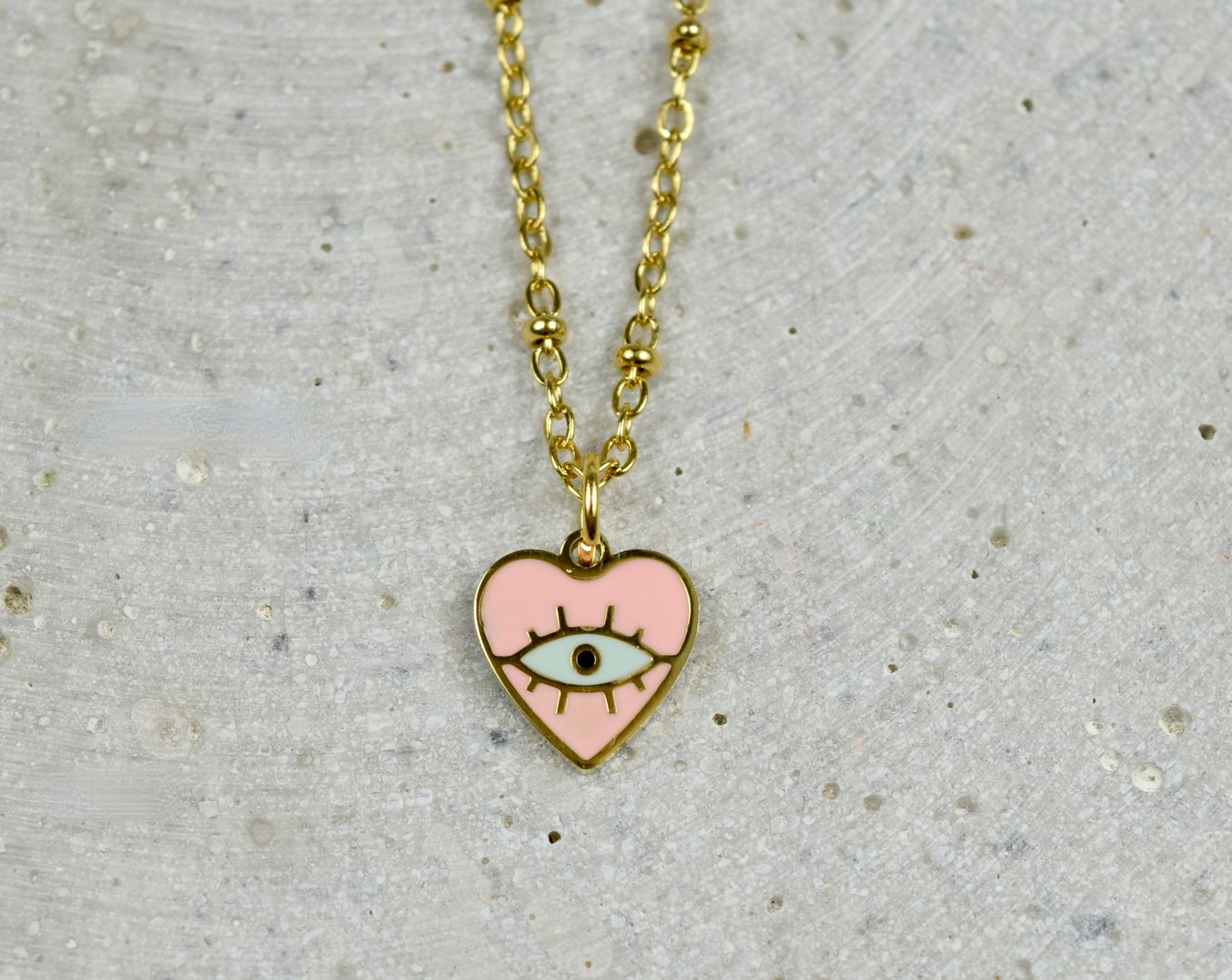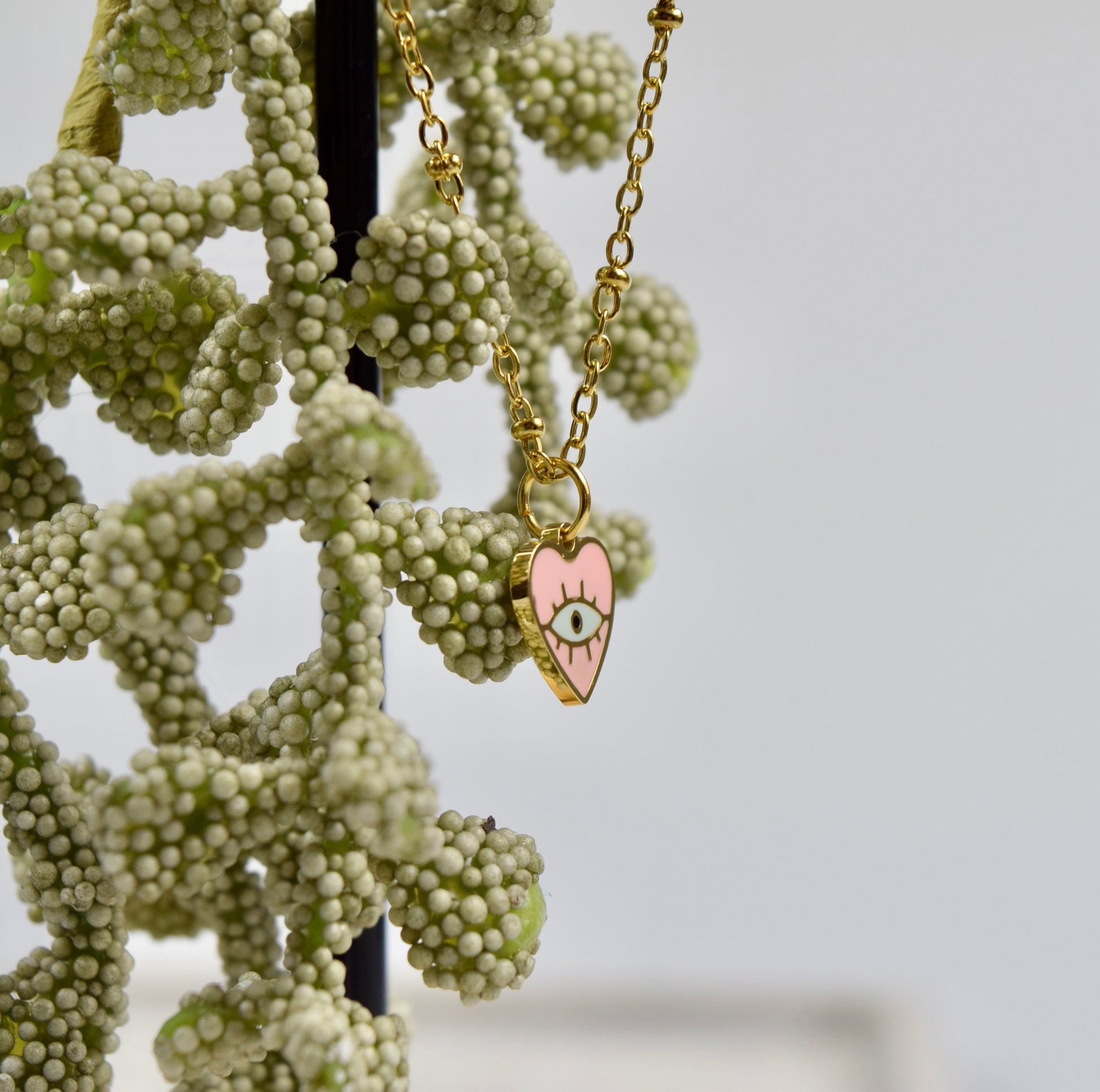 Edelstahl Kette 18 Karat vergoldet mit kleinem Edelstahl Amulett in Herzform. Rosa Emailliert und ein fein abgesetztes Nazar Auge in der Mitte.