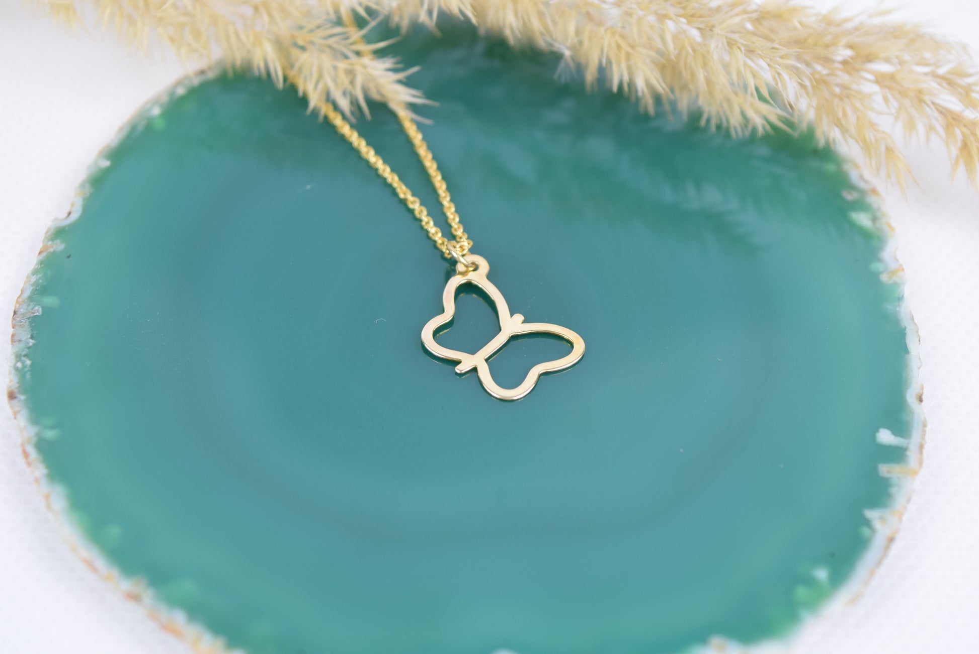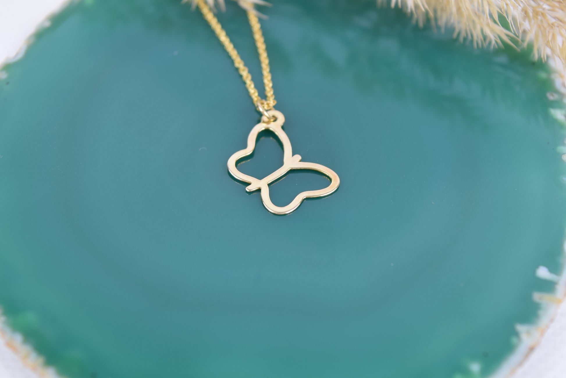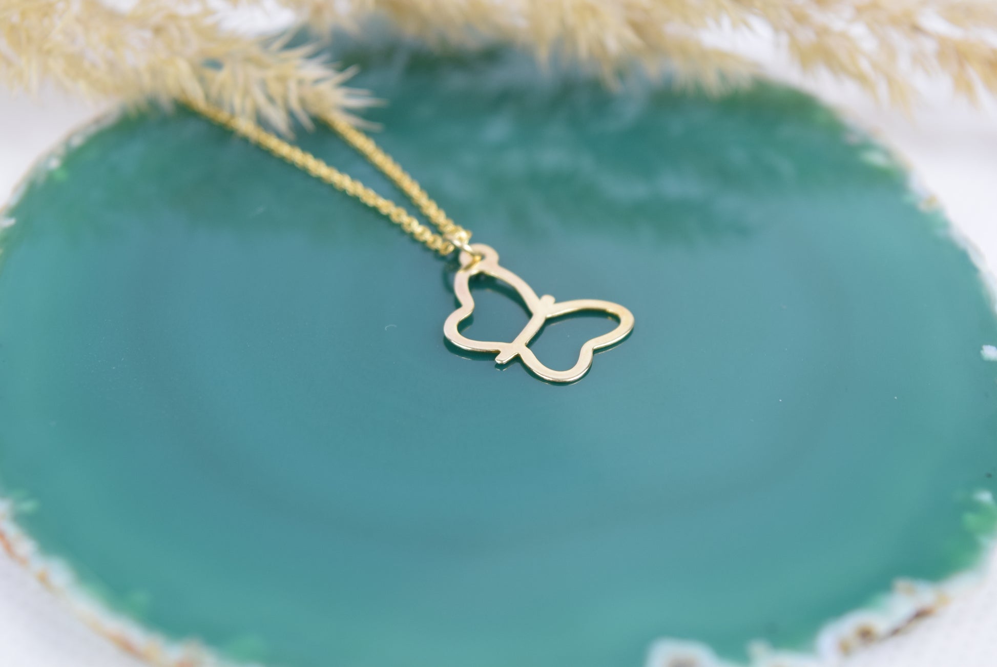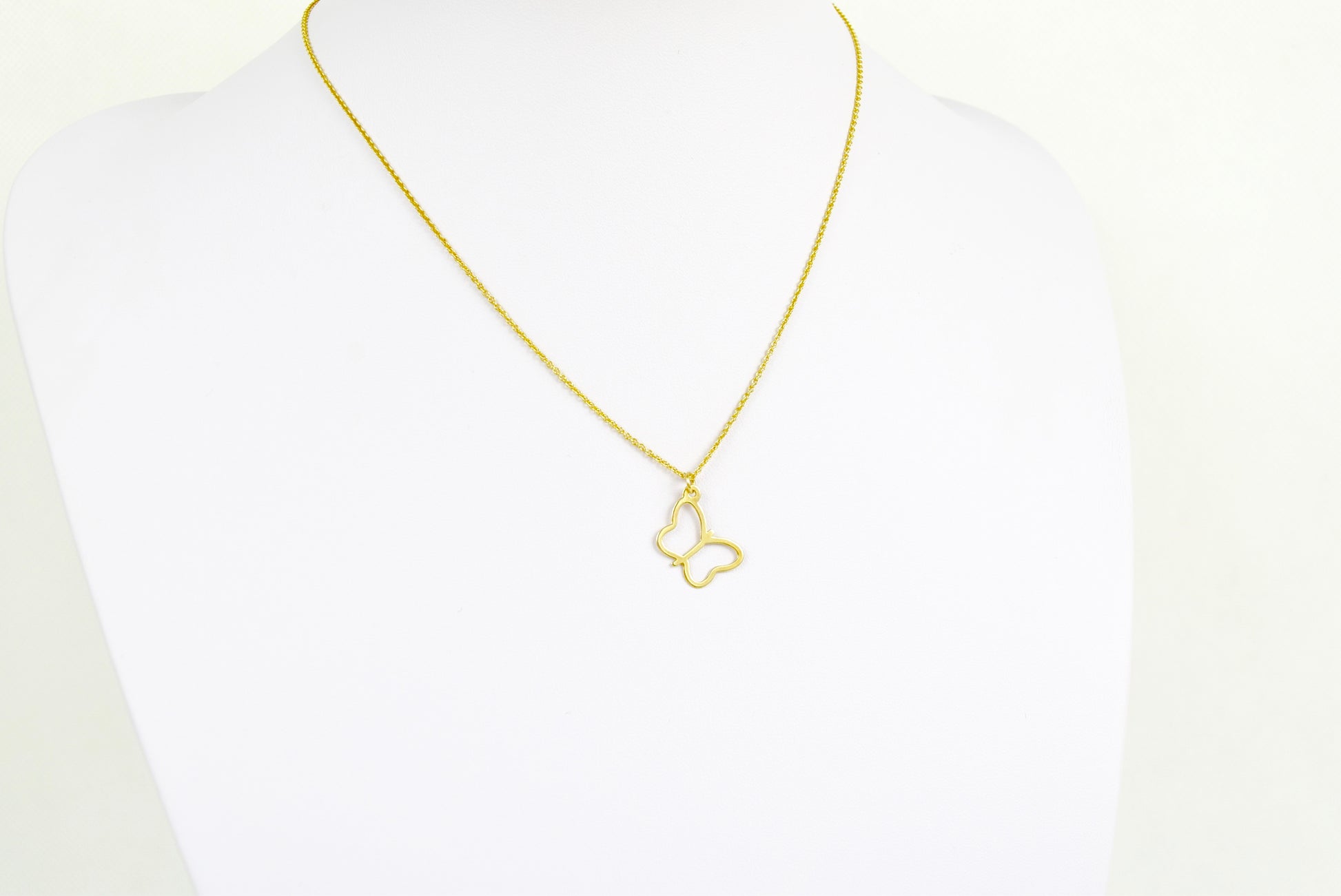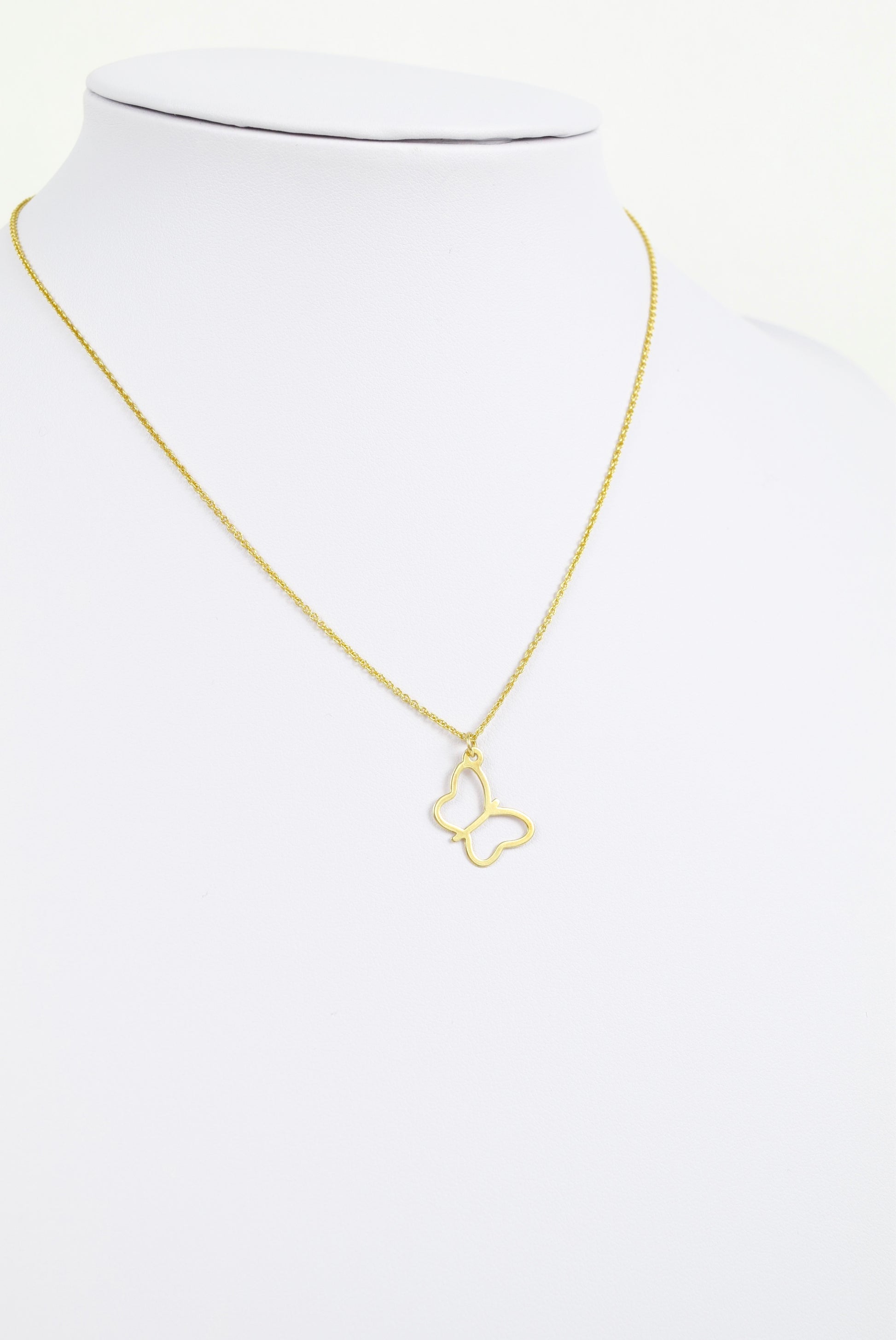 Feine 925 Silberkette vergoldet mit zartem Schmetterling in offener Form als Anhänger. Der Schmetterling wird oben mit Öse auf die Kette gefädelt. Der Schmetterling symbolisiert das Leben nach dem Tod, die freie Seele, steht für den Wandel und Transformation. Der Anhänger ist ebenfalls aus echt 925 Silber vergoldet. Feine Ankerkette 0,8mm, Anhänger 21mmx12mm.