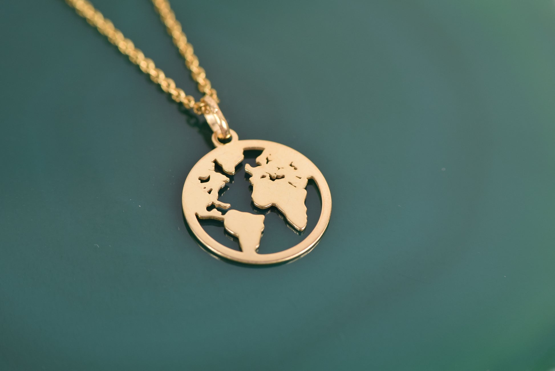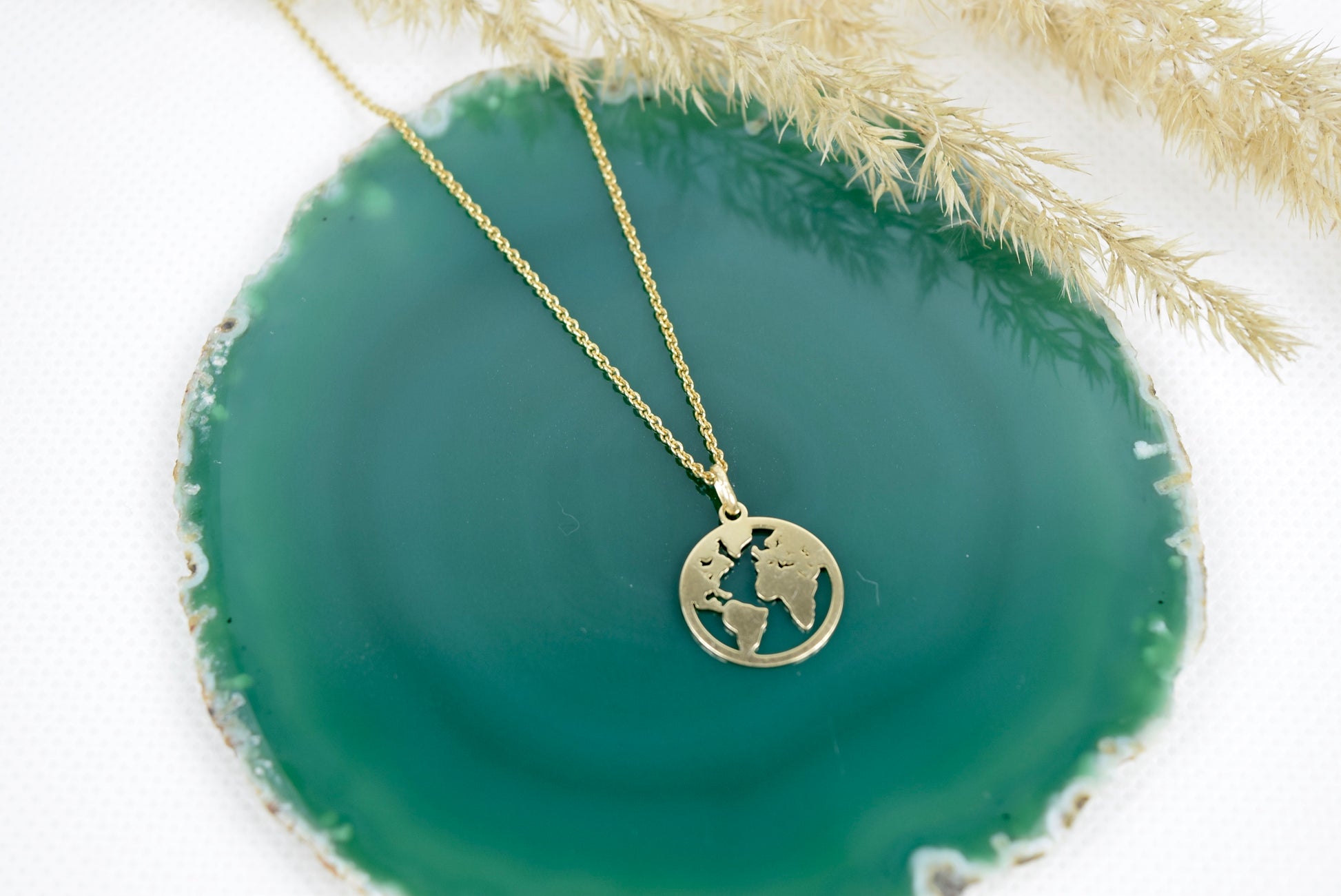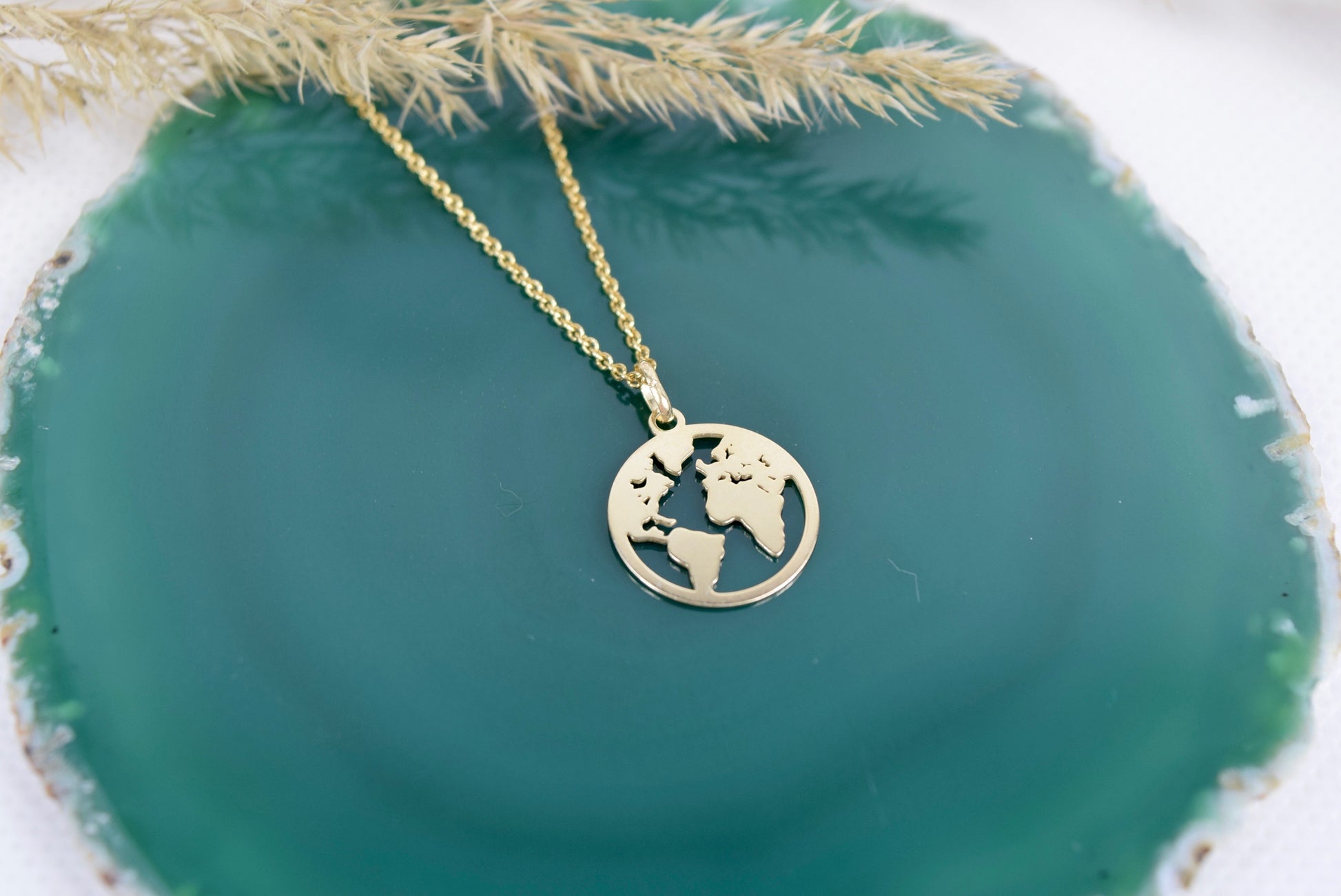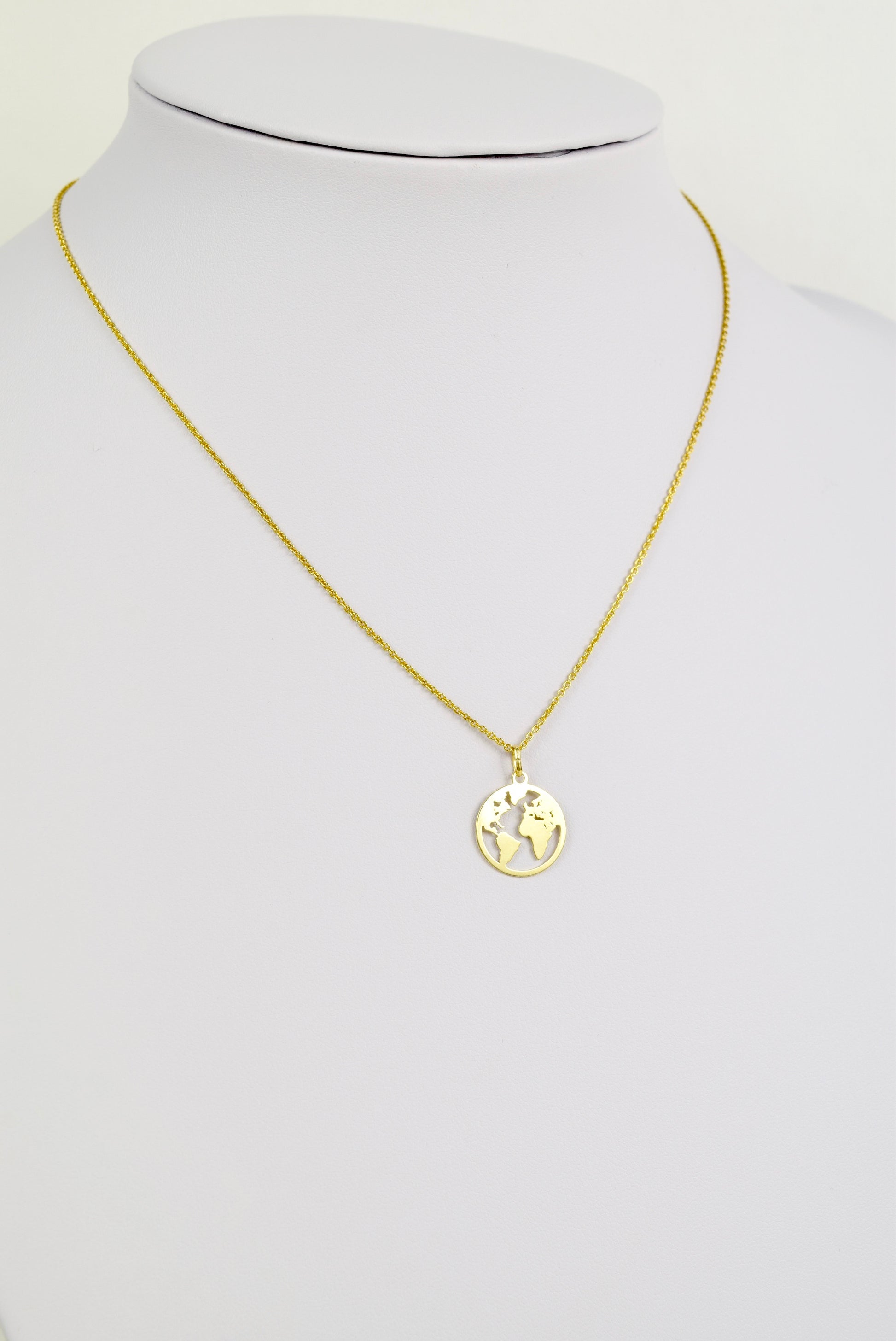 Feine 925 Silberkette vergoldet mit zartem Medaillon "Weltkarte" als Anhänger. Bist du auch so Urlaubsreif? Dann ist dies die richtige Kette die dich auf kommende Abenteuer begleiten wird! Der Anhänger ist ebenfalls aus 925 Silber und 18K vergoldet. Feine Ankerkette sehr gute Qualität (0,8mm), Kettenlänge 42cm, Anhänger ∅15mm. Benötigst du eine andere Kettenlänge? Erhältlich sind 42cm, 45cm, 50cm und 60cm. Wähle oben deine Wunschlänge aus.