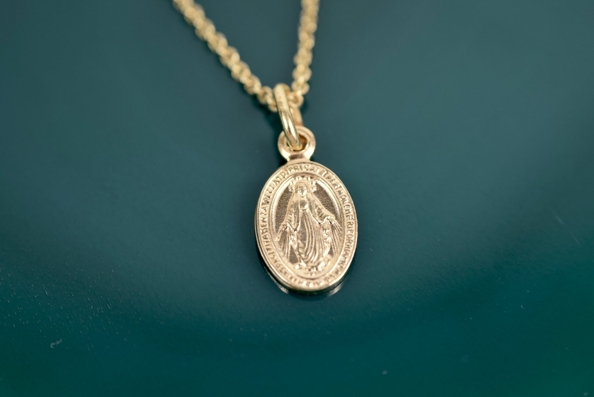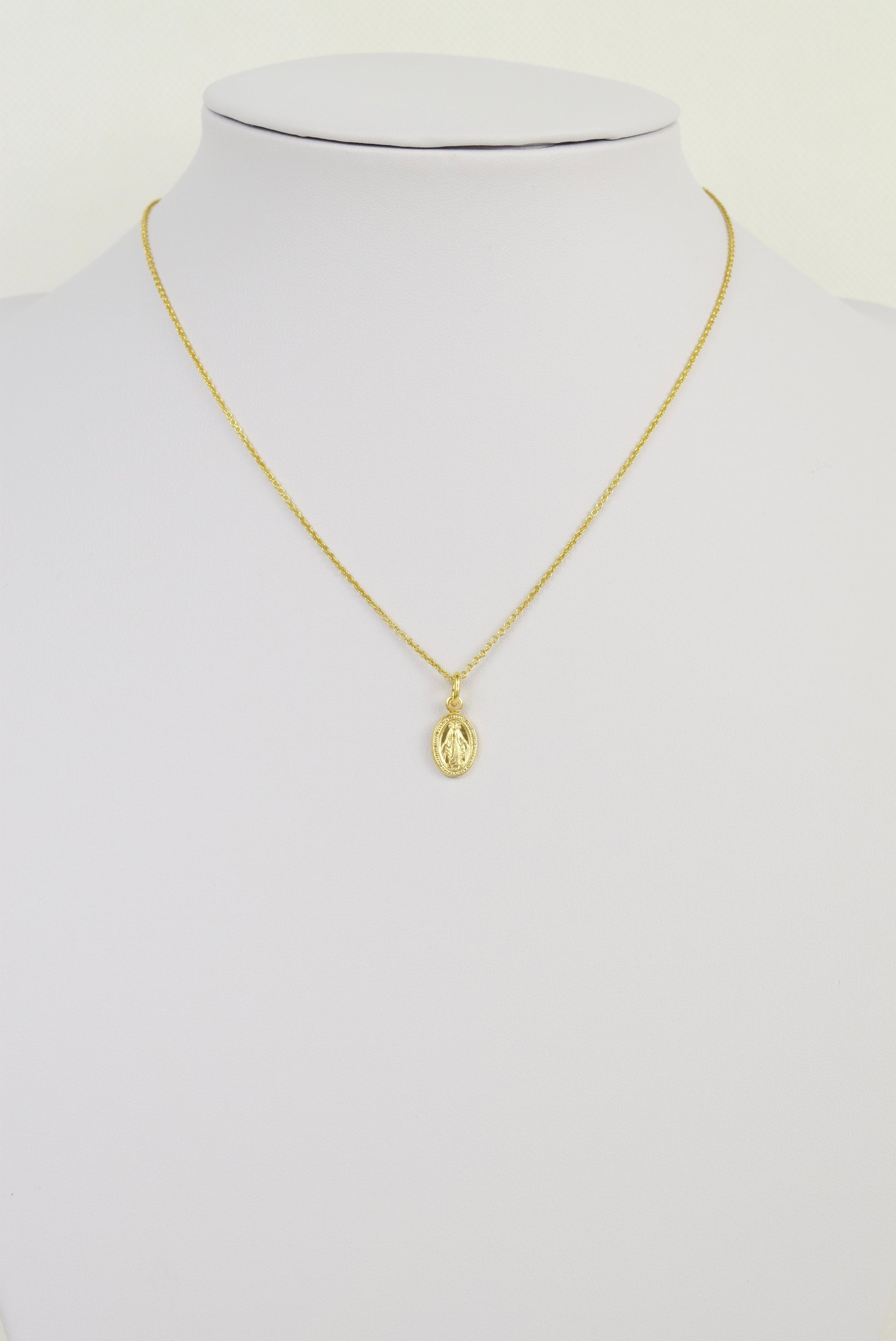 Feine 925 Silberkette vergoldet mit kleiner "wundertätige Medaille" mit der heiligen Maria als Prägung im Anhänger. Rückwertig ist ebenfalls eine Prägung. Die überlieferte Beschreibung habe ich hier angefügt. "Das Motiv der Wundertätigen Madonna geht auf die Marienerscheinung der katholischen Ordensfrau Catherine Labouré im Jahr 1830 in Paris zurück. In einem ovalen Rahmen, auf einer Weltkugel stehend habe Maria ihr aufgetragen eine Medaille mit den Worten: "O Maria, ohne Sünde empfangen, bitte für uns, die wir unsere Zuflucht zu dir nehmen.“ zu prägen. Diese bringe ihren Trägern große Gnaden. In der Folge wurde das Tragen der Medaille immer wieder mit wundertätigen Heilungen in Verbindung gebracht. Auch das Motiv auf der Rückseite geht auf die Erscheinung Marias zurück. Es zeigt ein "M" für Maria, den Tisch des Abendmahls und das Kreuz Jesu. Darunter dass Herz Jesu und das gebrochene Mutterherz." Der Anhänger ist ebenfalls aus 925 Silber vergoldet. Feine Ankerkette (1,2mm) in verschiedenen Längen erhältlich. Anhänger 14mmx8mm Ein besonderes Schmuckstück! Jetzt auch in Roségold und Silber erhältlich.