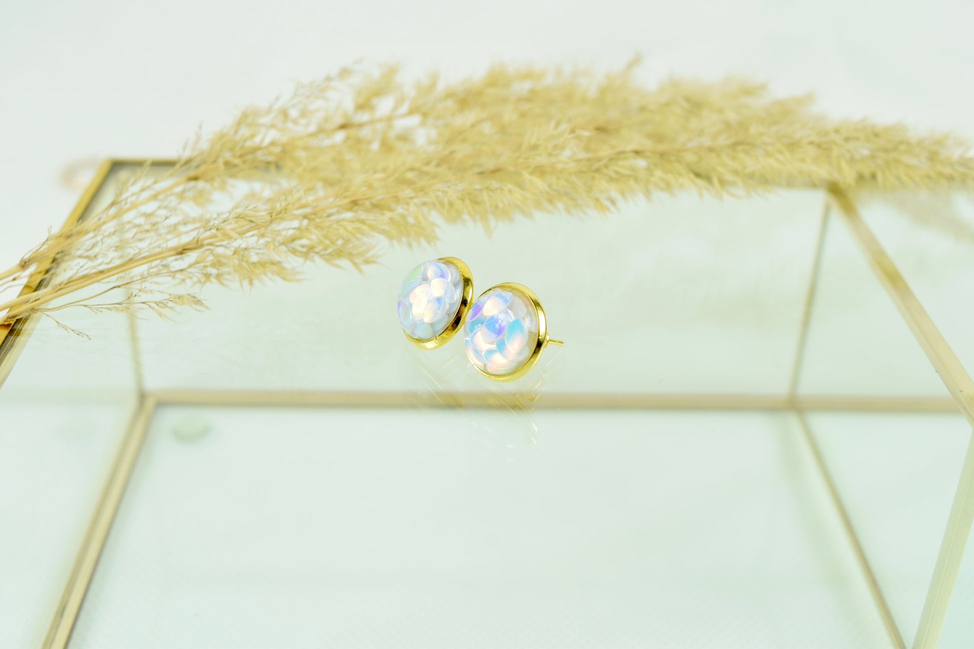 Ohrstecker in angesagter goldener Fassung mit Cabochon aus Harz. In den Cabochon sind mini kleine Glitzer Blättchen eingegossen, dadurch schimmert und schillert der Ohrstecker immer anders. Ein passender Ohrschmuck für eine Hochzeit: du kannst dir 4 Steinfarben passen zu deinem Brautkleid oder Farbthema wählen Lila/Pink changierend Grünlich/Türkis changierend Weiß/Rosa changierend Hellblau/Weiß/Rosa changierend Das Harz ist klar/Durchsichtig. Jeder Cabochon ist ein Unikat - das heißt jeder Stein sieht immer ein bisschen anders aus. Der Ohrstecker ist ganz leicht und sehr angenehm zu tragen. 12mm im Durchmesser - die optimale Größe für Ohrstecker! Ohrsteckerfassung aus Zamak. Steckerverschluss inklusive. Wähle zwischen vier Cabochon (Stein) Farben oder hier in Rosékupfer und Silberfarben erhältlich.